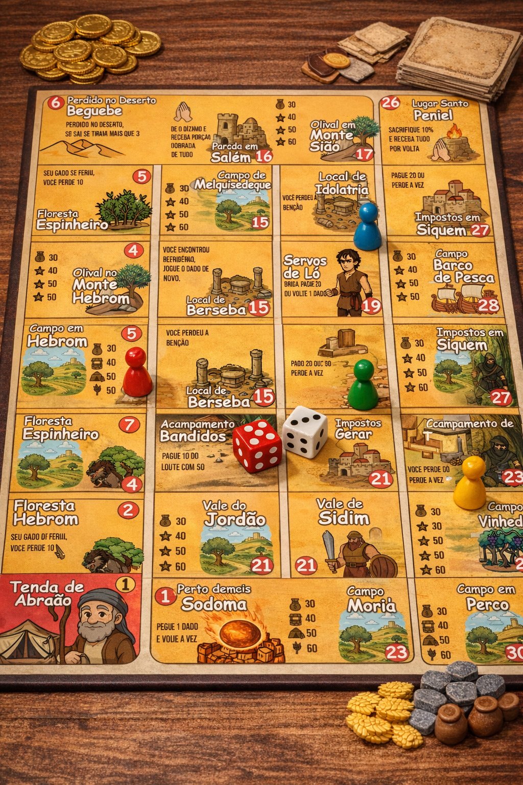 Seja um servo de Abraão e ande pelo tabuleiro usando talentos para comprar propriedades na terra de Canaã. O objetivo: Aprender educação financeira brincando enquanto enriquece Abraão.